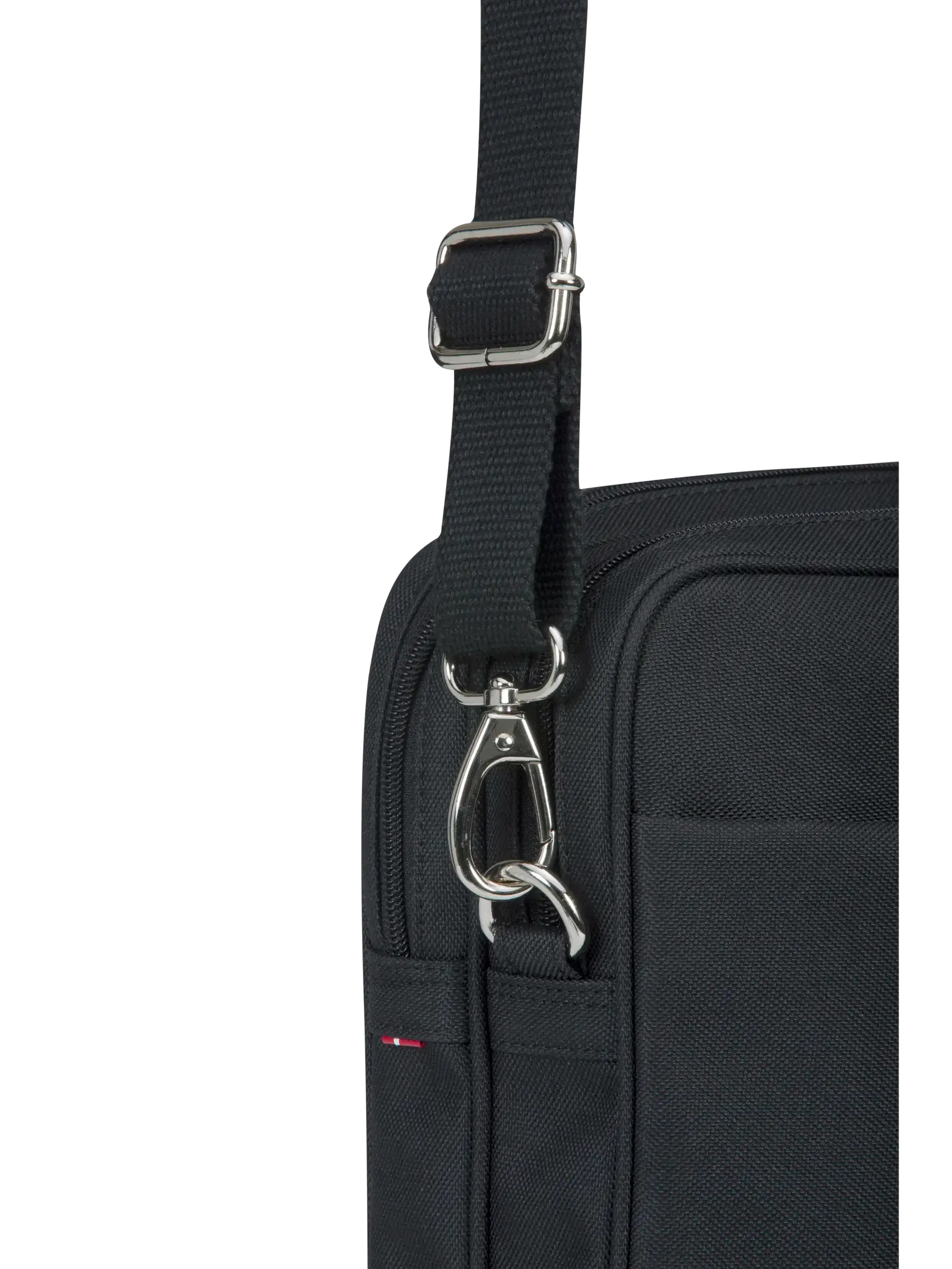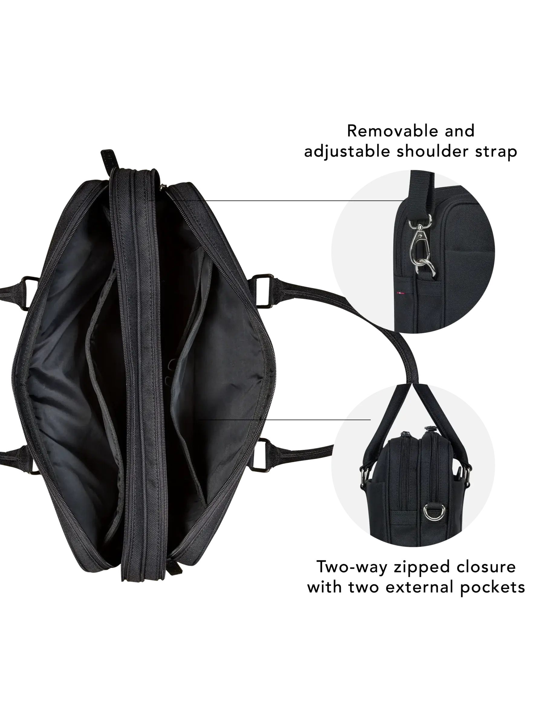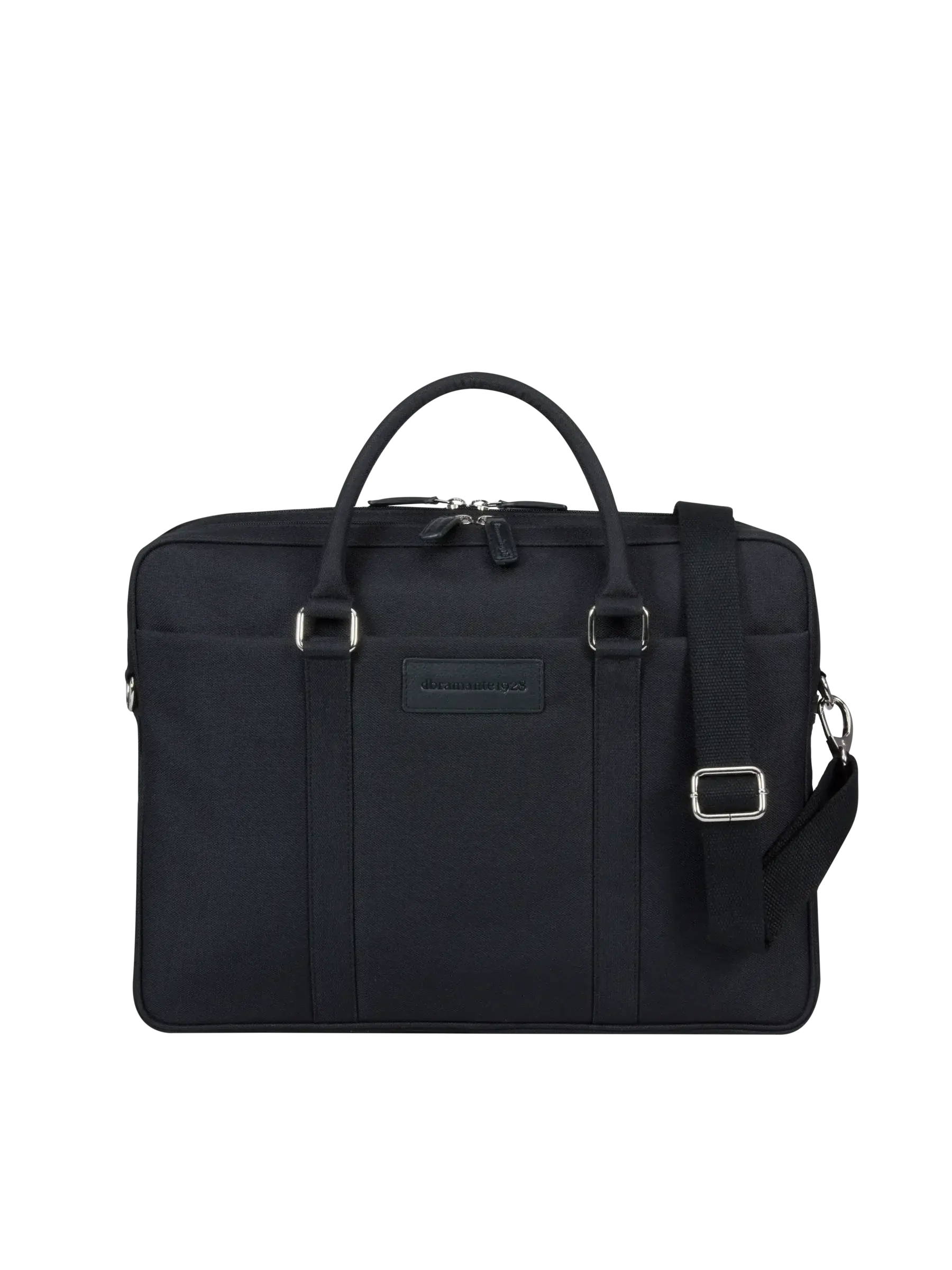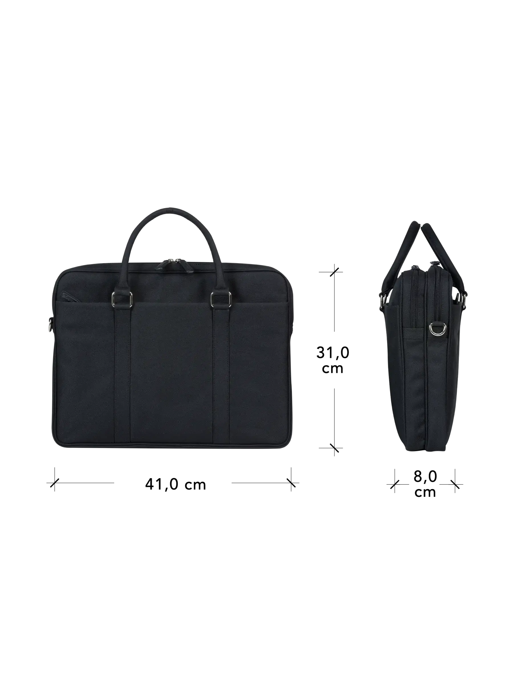 Handcrafted using durable material made from recycled plastic. This exceptional case has a streamlined silhouette and softly structured form featuring two main compartments with two-way zip fastenings and a padded section for an up to 16” laptop, two external pockets (one zipped) and a considered interior organization. This sleek business bag comes complete with a detachable shoulder strap and is finished with silver hardware.