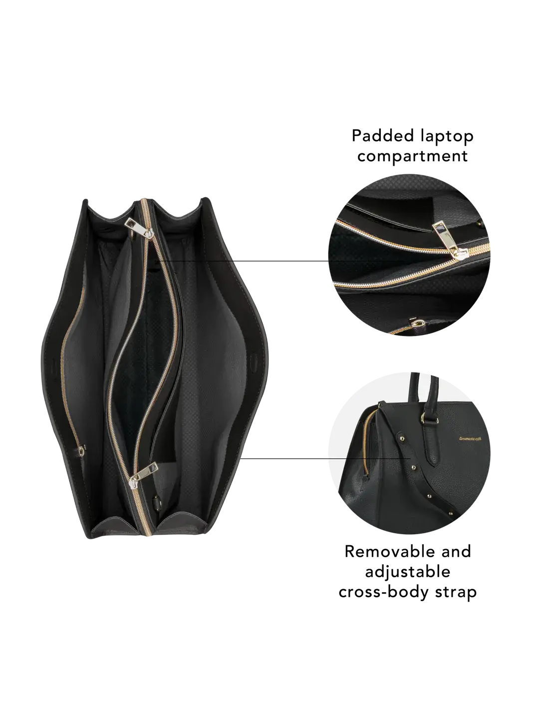 A lovely, stylish work bag made from luxurious natural leather, with room for a laptop inside. Perfect for everyday use when you need to keep your computer and papers with you while on the move. It has a padded pocket for a laptop that closes with a zip. This bag’s comfortable handle makes it easy to carry over your shoulder or in your hand. It also features a removable, adjustable cross-body strap. The bag is beautifully accented by rivets on the cross-body strap and feminine hardware in gold.
