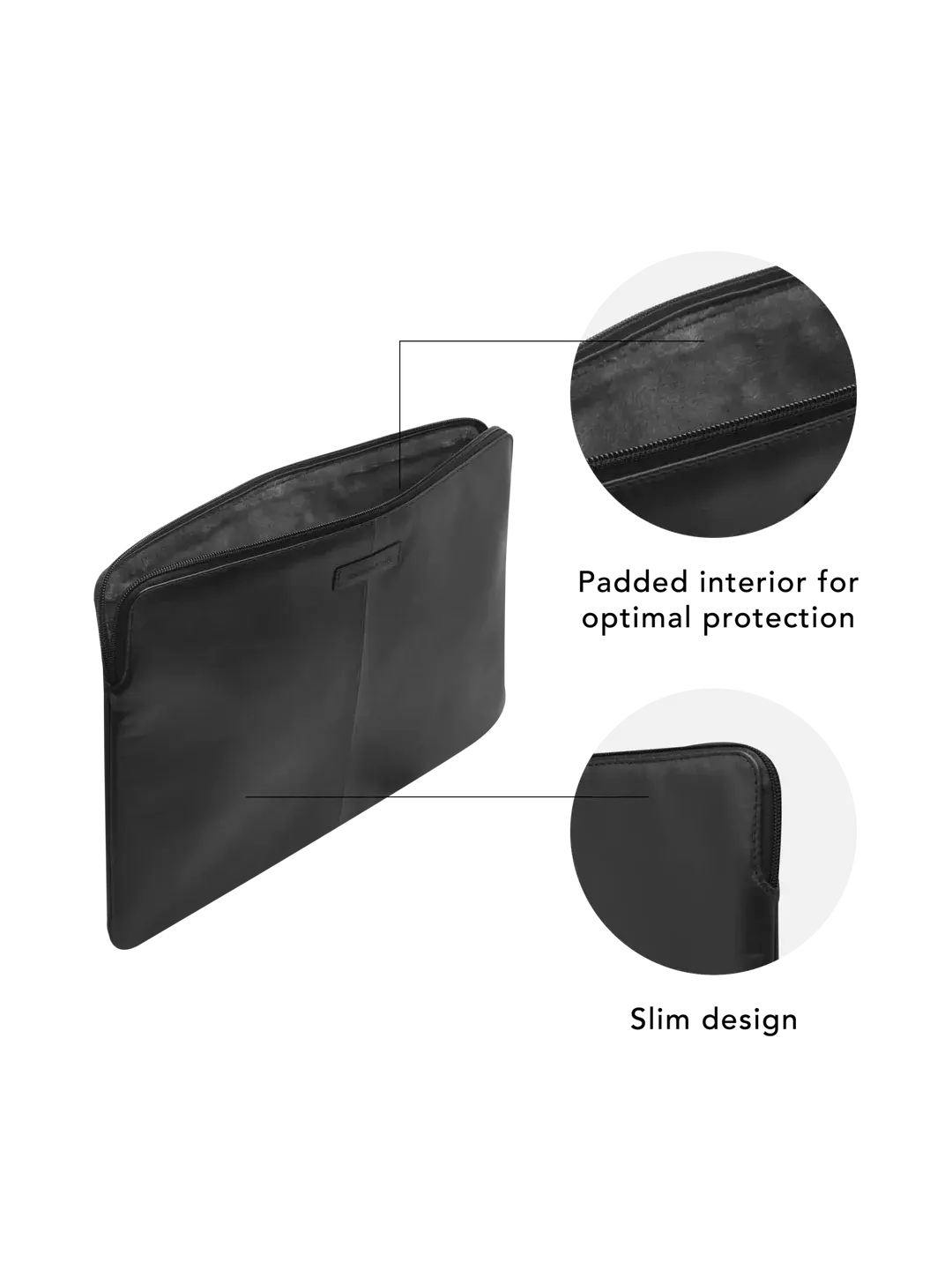 • Handcrafted from durable full-grain leather • Padded interior for optimal protection of your MacBook or PC • Slim yet impact protective design
