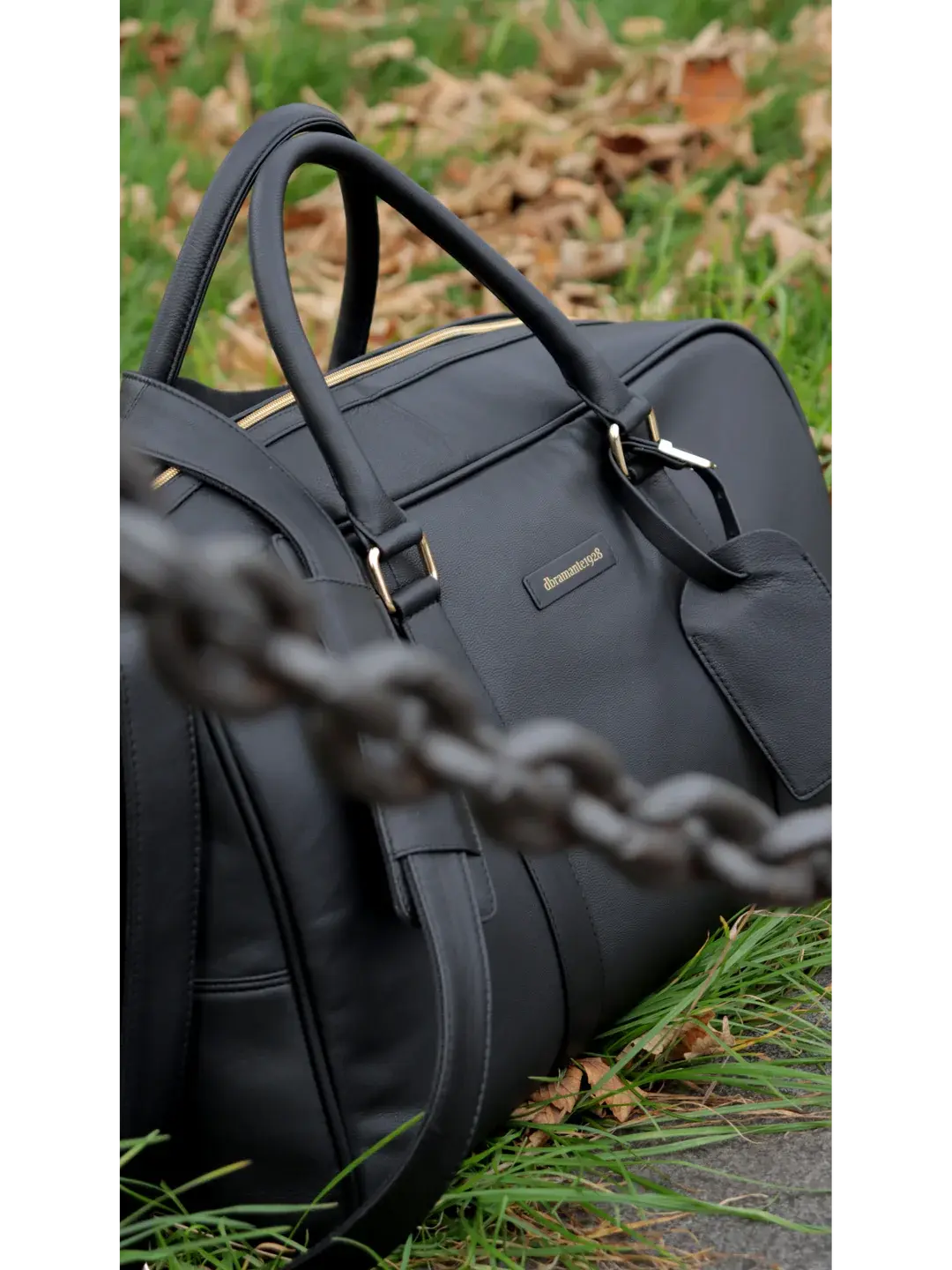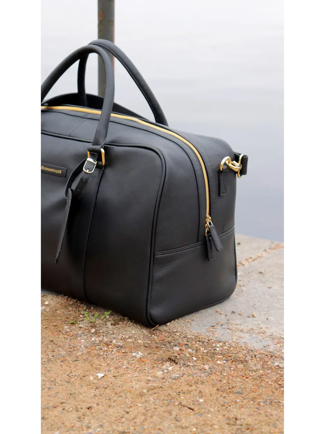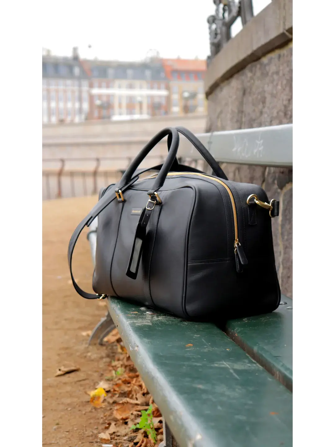 Verona is a functional and spacious weekender bag in a timeless design—the perfect travel companion. Handcrafted from durable full-grain leather, it radiates exclusivity and quality. Elegant gold details on the zippers and clasps add a luxurious touch, making it stand out. The main compartment offers ample space for clothes and essentials, with additional smaller pockets for easy organization.